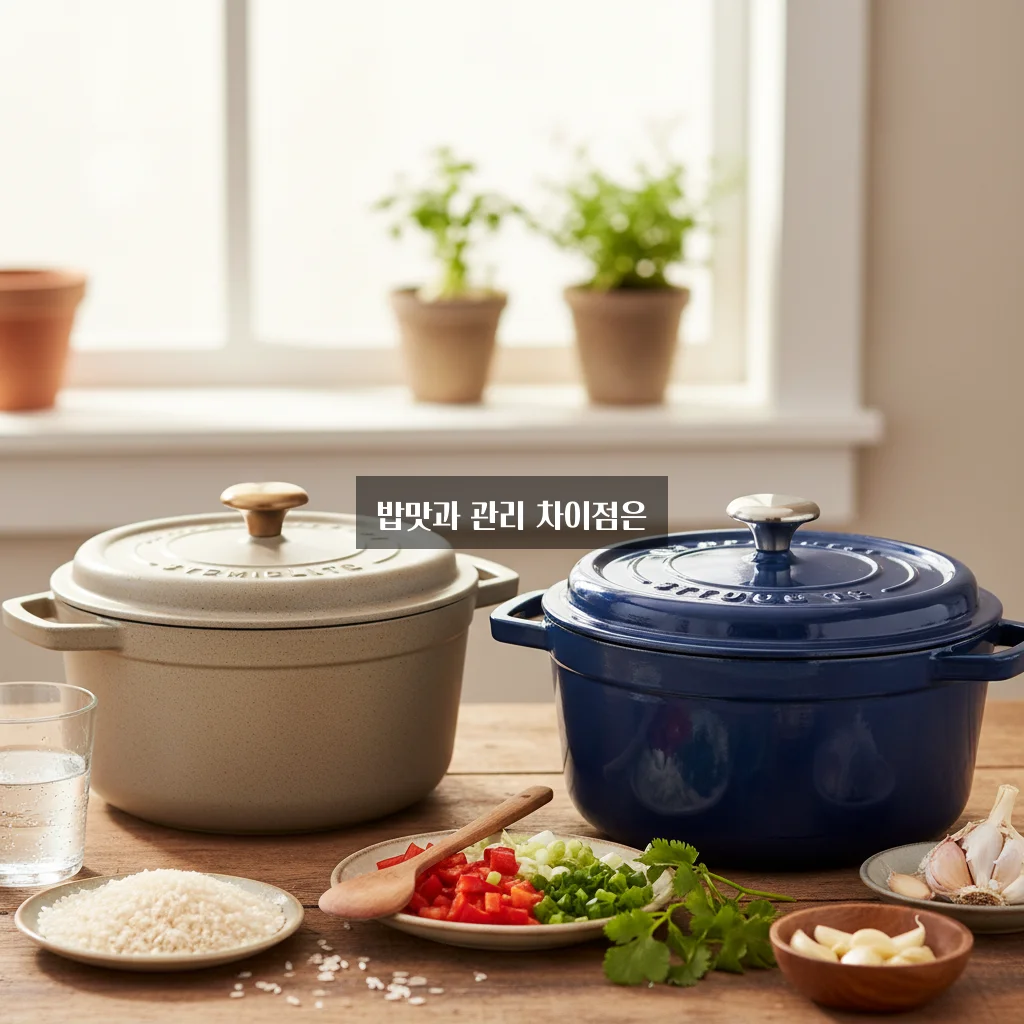 | 밥맛 및 조리 성능 | 뛰어난 열 보존과 균일한 열 분배로 밥알이 고르게 잘 익으며 촉촉하고 찰진 식감 연출 | 무거운 무쇠와 에나멜 코팅으로 열을 오래 유지하며, 밥이 눌어붙기 쉬워 누룽지 맛 내기에 적합 |